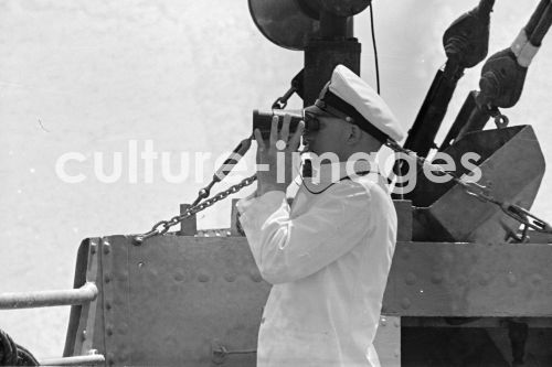 Offizier mit Fernglas. Seefahrt, Schiffsfahrt, Seemann, an Bord, Seemann. Aus der Sammlung Hanns Tschira, Bordfotograf des Norddeutschen Lloyd 1930-1939. Navigation, Ship trip, Sailor, aboard, Sailor, Sailor, maritime. Collection Hanns Tschira, photographer of the North German Lloyd 1930-1939.