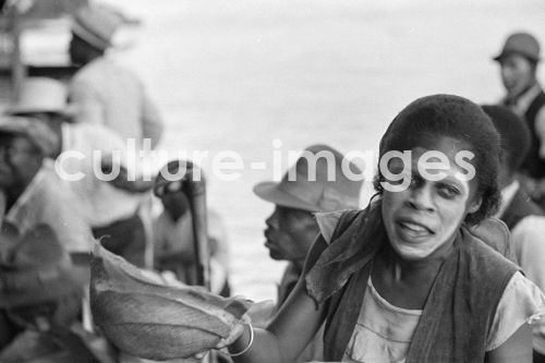 Trinidad und Tobago, Karibik, Port of Spain, Boot, Musikanten, Leute. Aus der Sammlung Hanns Tschira, Bordfotograf des Norddeutschen Lloyd 1930-1939. Trinidad and Tobago, The Caribbean, Port of Spain, Boat, Musicians, People. Collection Hanns Tschira, photographer of the North German Lloyd 1930-1939.
