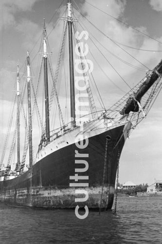 Bahamas, Nassau, Karibik, Schiff, Segelschiff, Viermaster, Commonwealth der Bahamas, Westindische Inseln. Aus der Sammlung Hanns Tschira, Bordfotograf des Norddeutschen Lloyd 1930-1939. The Bahamas, Nassau, The Caribbean, Ship, Sailing ship, Four-masted sailing ship, Commonwealth of the Bahamas, West Indian islands, maritime. Collection Hanns Tschira, photographer of the North German Lloyd 1930-1939.