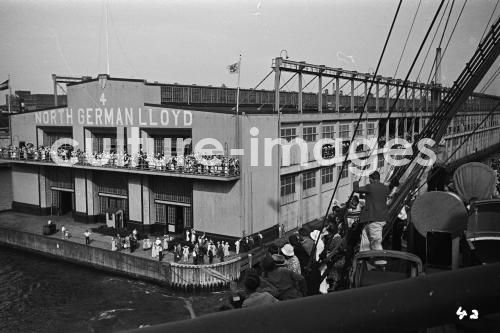 Schiff Bremen, anlegen, Aussenansicht, Passagierschiff, Dampfer, Schiff, Norddeutscher Lloyd, TS Bremen, Turbine Steamer, Turbinendampfer, an Bord. Aus der Sammlung Hanns Tschira, Bordfotograf des Norddeutschen Lloyd 1930-1939. Ship Bremen, steamer, Ship, North German Lloyd, Bremen TS, Turbine Steamer, Turbine steamboat, landing, Outside view, Passenger liner, Aboard, sea journey, cruise, passage. Collection Hanns Tschira, photographer of the North German Lloyd 1930-1939.