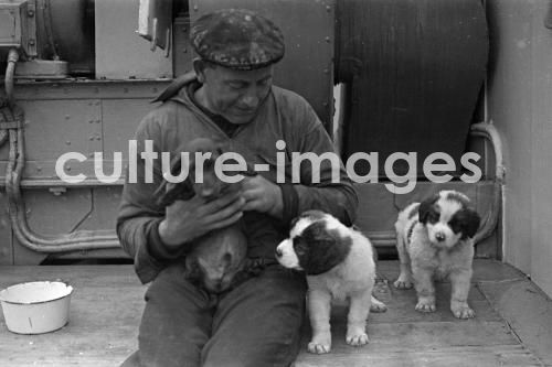 Seefahrt, Norddeutscher Lloyd, Columbus, Passagierdampfer, an Deck, Dampfer, Dampfschiffahrt, Schiffahrt, Hund, Seemann. Aus der Sammlung Hanns Tschira, Bordfotograf des Norddeutschen Lloyd 1930-1939. Navigation, North German Lloyd, Ship Columbus, Passenger liner, Sea ship, Steamboat, Steam navigation, Ship, Columbus, Navigation, Dog, Sailor . Collection Hanns Tschira, photographer of the North German Lloyd 1930-1939.