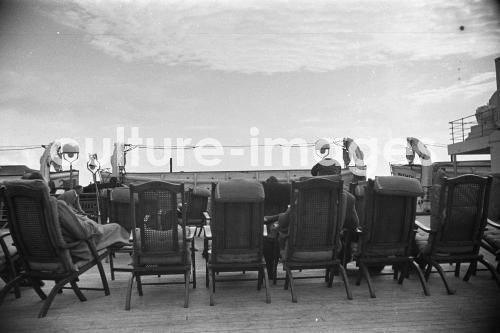 Seefahrt, Norddeutscher Lloyd, Columbus, Passagierdampfer, an Deck, Dampfer, Dampfschiffahrt, Aussenansicht, Passagiere, Schiffahrt. Aus der Sammlung Hanns Tschira, Bordfotograf des Norddeutschen Lloyd 1930-1939. Navigation, North German Lloyd, Ship Columbus, Passenger liner, Sea ship, Steamboat, Steam navigation, Ship, Columbus, Navigation, sea journey, passage, cruise. Collection Hanns Tschira, photographer of the North German Lloyd 1930-1939.