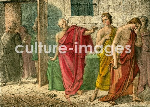 "1001659 ( 1000 ) Tod des Sokrates , griechischer Philosoph , geboren 469 v. Chr. , gestorben durch Gift 399 v. Chr. , kolorierter Kupferstich aus "" Historische Bilder "" , eine Reihe anziehender Schilderungen hervorragender Männer und Ereignisse der Weltgeschichte , zusammengestellt von Dr. F. Orelli , Verlag von August Riese , Berlin , ca. 1850 . Stichwörter : Person , Persoenlichkeit , Mann , Philosophie , Griechenland , Antike , Schierlingsbecher , Hinrichtung , Gottlosigkeit , Asebie , Geschichte , Todesurteil , Kunsturheberrechte werden nicht vertreten, VG Bild - Kunst Rechte beachten . The death of Socrates , greek philosopher , born 469 before Christ , died / executed 399 before Christ by poison ( cup of hemlock ) , coloured copperplate engraving from "" "" Historische Bilder "" ( historical pictures ) , accounts about well-known events or men , arranged by Dr. F. Orelli , publishing house August Riese , Berlin , about 1850 . Keywords : person , man , philosophy , history , the Classical World , the Ancient World , classsical antiquity , execution , death sentence , Greece , no copyright of art. "