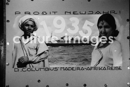 Seefahrt, Norddeutscher Lloyd, Schiff Columbus, Plakat, Prosit Neujahr. Aus der Sammlung Hanns Tschira, Bordfotograf des Norddeutschen Lloyd 1930-1939 navigation, North German Lloyd, ship Columbus, poster, Prosit New Year's Day. Collection Hanns Tschira, photographer of the North German Lloyd 1930-1939