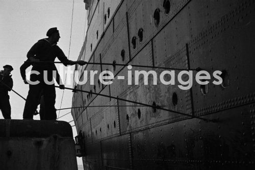 Seefahrt, Norddeutscher Lloyd, Schiff Columbus, Schiffahrt, Dampfer, Passagierschiff, Dampfschiff, Malerarbeiten, Beiboot, Detail. Aus der Sammlung Hanns Tschira, Bordfotograf des Norddeutschen Lloyd 1930-1939. navigation, North German Lloyd, ship Columbus, navigation, steamboat, passenger liner, steamer, paintings, sloop, detail. Collection Hanns Tschira, photographer of the North German Lloyd 1930-1939.