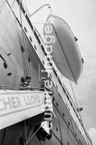 Norddeutscher Lloyd, Schiff Columbus, Schiffahrt, Dampfer, Passagierschiff, Dampfschiff, Fallreep, Beiboot, Detail. Aus der Sammlung Hanns Tschira, Bordfotograf des Norddeutschen Lloyd 1930-1939. North German Lloyd, ship Columbus, navigation, steamboat, passenger liner, steamer, gangway, sloop, detail. Collection Hanns Tschira, photographer of the North German Lloyd 1930-1939.