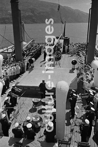 Seefahrt, Norddeutscher Lloyd, Schiff Columbus, Schiffahrt, Dampfer, Passagierschiff, Dampfschiff, Feier der NS, Appell mit NS-Flagge, Nationalsozialismus, Detail. Aus der Sammlung Hanns Tschira, Bordfotograf des Norddeutschen Lloyd 1930-1939. navigation, North German Lloyd, ship Columbus, navigation, steamboat, passenger liner, steamer, celebration of the NS, National Socialism, detail. Collection Hanns Tschira, photographer of the North German Lloyd 1930-1939.