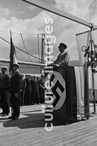Seefahrt, Norddeutscher Lloyd, Schiff Columbus, Schiffahrt, Dampfer, Passagierschiff, Nationalflagge des Deutschen Reiches (1935?1945) mit NS-Hakenkreuz, Feier der NS, Nationalsozialismus, Detail. Aus der Sammlung Hanns Tschira, Bordfotograf des Norddeutschen Lloyd 1930-1939. navigation, North German Lloyd, ship Columbus, navigation, steamboat, passenger liner, National flag of the German Reich (1935-1945) with NS swastika, celebration of the NS, National Socialism, detail. Collection Hanns Tschira, photographer of the North German Lloyd 1930-1939."