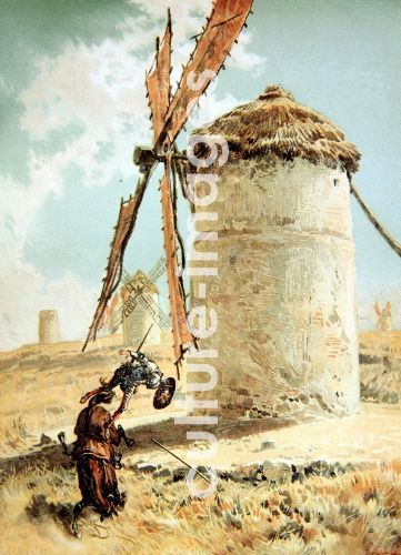 Don Quijote, Held in Miguel de Cervantes' Roman El ingenioso hidalgo Don Quixote de la Mancha, übersetzt Der sinnreiche Junker Don Quijote von der Mancha, auch Don Quichotte . ALCALA DE HENARES 1547-1616 DON QUIJOTE DE LA MANCHA ILLUSTRATION EPISODIO DE LOS MOLINOS POR RICARDO BALACA. EDICION MUNTANER Y SIMON. BARCELONA 1880-1883 - CERVANTES SAAVEDRA, MIGUEL ESCRITOR ESPAÑOL. ALCALA DE HENARES 1547-1616 DON QUIJOTE DE LA MANCHA ILUSTRACION EPISODIO DE LOS MOLINOS POR RICARDO BALACA. EDICION MUNTANER Y SIMON. BARCELONA 1880-1883