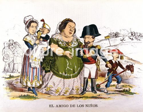 Isabella II. María Luisa (span. Isabel II, * 10. Oktober 1830 in Madrid, ? 9. April 1904 in Paris) , Königin von Spanien.Karikatur EN LA REVISTA LA FLACA zusammen mit Napoleon III - ISABEL II REINA DE ESPAÑA. MADRID 1830-1904 CARICATURA EN LA REVISTA LA FLACA JUNTO A NAPOLEON III