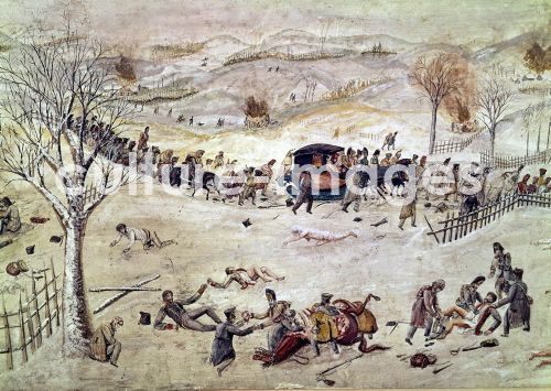 Napoleon I., Kaiser der Franzosen, 1769 - 1821. Rückzug der Franzosen nach ihrem Einmarsch in Moskau - NAPOLEON I EMPERADOR DE FRANCES . 1769 - 1821 RETIRADA DEL EJERCITO FRANCES DESPUES DE SU ENTRADA EN MOSCU HOSTIGADOS POR LOS COSACOS LOS SOLDADOS FRANCESES MURIERON A MILES
