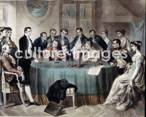 Alessandro Giuseppe Antonio Anastasio Graf von Volta, italienischer Physiker und Erfinder der Batterie, 1745 - 1827. VOLTA präsentiert seine Werke dem ersten Konsul ( Napoleon ) Lithographie von L . TURGIS - VOLTA, ALEJANDRO FISICO ITALIANO . 1745 - 1827 VOLTA PRESENTA SUS EXPERIMENTOS AL PRIMER CONSUL ( NAPOLEON ) Lithographie DE L . TURGIS