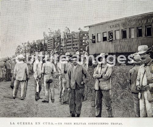 Kämpfe der Kolonie Kuba um Unabhängigkeit von Spanien, 1868 - 1898. TREN MILITAR CONDUCIENDO TROPAS, 1898 Stich - GUERRA DE CUBA 1868 - 1898 NOMBRE GENERICO CON EL QUE SE CONOCE LAS TRES GUERRAS POR LA INDEPENDENCIA DE CUBA DE ESPAÑA TREN MILITAR CONDUCIENDO TROPAS, 1898 Grabado DE LA , Illustration