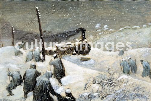 Eisenbahn in Spanien, Zug mit Reisenden steckt im Schnee fest in POZAZAL, SANTANDER, Stich - FERROCARRILES ESPAÑA POZAZAL ( SANTANDER )TREN DETENIDO POR LAS NIEVES Grabado , Illustration