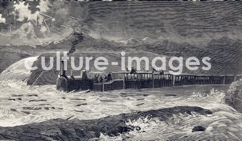 Eisenbahn in Spanien, Zug, Postzug von BARCELONA steckt fest zwischen SELGUA und TOMILLO wegen Überschwemmung am Fluss CINCA, 28-10-1879 Stich - FERROCARRILES ESPAÑA EL TREN COPRREO DE BARCELONA DETENIDO ENTRE SELGUA Y TOMILLO POR LA INUNDACION DEL RIO CINCA, EL 28-10-1879 Grabado ILUSTRTACION ESPAÑOLA Y AMERICANA