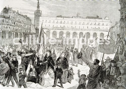SEVILLA PLAZA DE SAN FRANCISCO MANIFESTACION LIBRE - CULTISTA Stich von MUSEO UNIVERSAL, Jahrhundert XIX Zeichnung von VALERIANO DOMINGUEZ BECQUER SEVILLA PINTADO - SEVILLA PLAZA DE SAN FRANCISCO MANIFESTACION LIBRE - CULTISTA Grabado DEL MUSEO UNIVERSAL, SIEGLO XIX DIBUJO DE VALERIANO DOMINGUEZ BECQUER SEVILLA PINTADO
