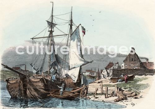 Zwei Kuffen - die vordere ohne Mastwerk - und Boote am Ufer eines Sielhafen Schönleber, Gustav Holz(stich). Koloriert ca. 1880