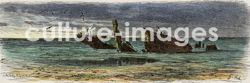 Wrack eines Küstensegler, geborsten und im Sand oder Schlick versunken, typische Szene der Wattküste, Sandung Schönleber, Gustav Holz(stich). Koloriert ca. 1880