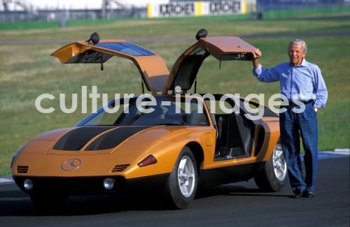 Auto, Mercedes C 111, 2, Oldtimer, Youngtimer, Baujahr 1970, Sportwagen, Coupé, Coupe, orange-schwarz, FGUJ, stehend, schräg von vorne, Frontansicht, Rennstrecke, daneben: Paul Freré (Formel1-Rennfahrer von 1952 bis 1956, geb. 30.01.17 in Belgien) Car, Mercedes C 111, 2, vintage car, old car, model year 1970, sports car, Coupé, Coupe, orange-black, standing, diagonal front, front view, circuit, racetrack, race course, aside: Paul Freré (Formel1-racer, racing, race, driver 1952 - 1956