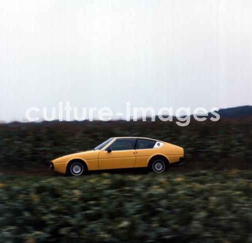 Auto, Matra Bageera, Sportwagen, 3-Sitzer, gelb, Baujahr 1973-1977, fahrend, Landstraße, Seitenansicht, Coupé, Coupe, Youngtimer Car, Matra Bageera, sports car, 3-seatsr, yellow, model year 1973-1977, driving, road, country road, side view, Coupé, Coupe, old car
