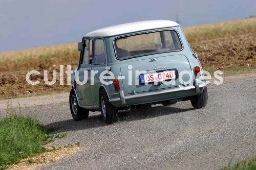 Auto, Morris Cooper 1275 S Mk I, Oldtimer, Baujahr 1964-1971, Minicar, 60er Jahre, 70er Jahre, grau, weiss, FGUJ, fahrend, schräg von hinten, Heckansicht, Landstraße Car, Morris Cooper 1275 S Mk I, vintage car, model year 1964-1971, small car, 1960s, sixties, 1970s, seventies, grey, white, driving, diagonal back, back view, road, country road