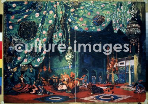 Bühnenbildentwurf zum Ballett Scheherazade von N. Rimski-Korsakow, Bakst, Léon (1866-1924). Aquarell, Gouache, Gold auf Karton, Bühnenmalerei, 1910, Musée des Arts Décoratifs, Paris, Russland - Stage design for the ballet Sheherazade by N. Rimsky-Korsakov, Bakst, Léon (1866-1924), watercolour, gouache, gold on cardboard, painting, 1910, Russia, Musée des Arts Décoratifs, Paris