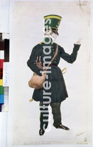 Briefträger. Kostümentwurf zum Ballett Die Puppenfee von J. Bayer, Bakst, Léon (1866-1924). Aquarell auf Papier, Bühnenmalerei, 1903, Staatliches Russisches Museum, St. Petersburg, Russland - Postman. Costume design for the ballet The Fairy Doll by J. Bayer, Bakst, Léon (1866-1924), watercolour on paper, painting, 1903, Russia, State Russian Museum, St. Petersburg