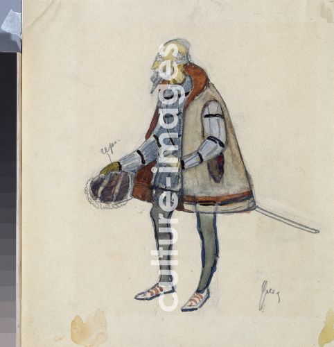 Kostümentwurf zum Theaterstück Der geizige Ritter von A. Puschkin, Uljanow, Nikolai Pawlowitsch (1875-1949), Bleistift, Aquarell auf Papier, BühnenmalereI. 1918. A. Puschkin-Gedenkmuseum, St. Petersburg, Russland.