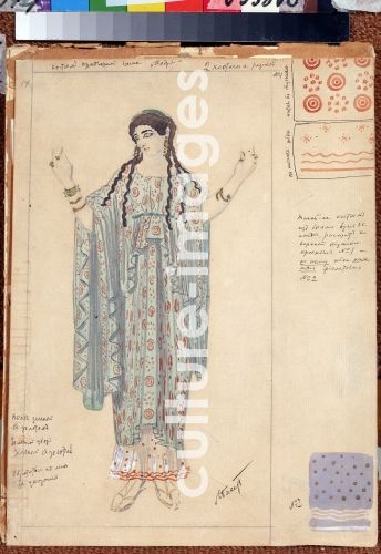 Hofdame. Kostümentwurf zum Theaterstück Hippolytos von Euripides, Bakst, Léon (1866-1924). Aquarell, Tusche, weiße und goldene Farbe auf Papier, Bühnenmalerei, 1902, Staatliches Kunstmuseum, Odessa, Russland - Lady-in-waiting. Costume design for the drama Hippolytus by Euripides, Bakst, Léon (1866-1924), watercolour, ink, white and gold colours on paper, painting, 1902, Russia, State Art Museum, Odessa