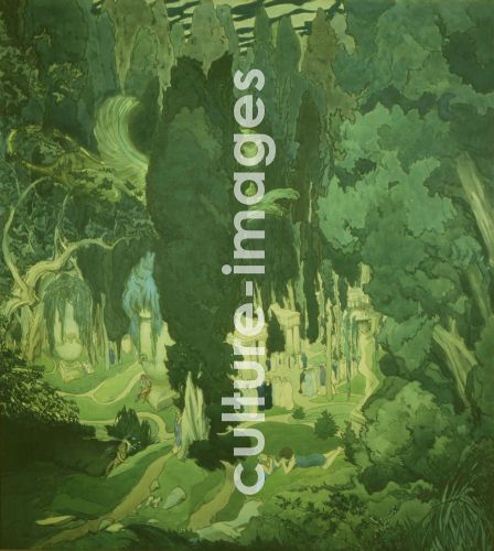 Das Elysion, Bakst, Léon (1866-1924). Aquarell, Gouache, Gold und weisse Farbe auf Papier, Jugendstil, 1906, Staatliche Tretjakow-Galerie, Moskau, Russland - Elysium, Bakst, Léon (1866-1924), watercolour, gouache, gold und white colours on paper, Art Nouveau, 1906, Russia, State Tretyakov Gallery, Moscow