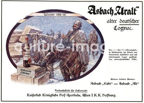 Asbach ' Uralt ', alter deutscher Cognac, Weinbrand, herausgegeben zwischen 1914 - 1918, Zeitschrift unbekannt, Originalgröße 25 cm x 18 cm, 1910er Jahre. Text: Verkaufsstelle für Österreich: Kaiserlich Königliche Hoapotheke Wien, Hofburg