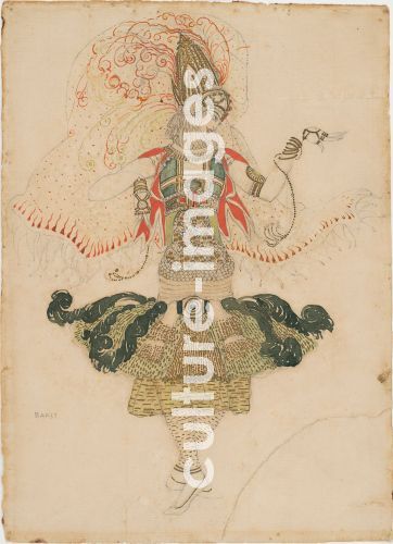 Bakst, Léon (1866-1924), Kostümentwurf für Tamara Karsawina im Ballett Der Feuervogel (L'oiseau de feu) von I. StrawinskI. Bleistift, Aquarell, Gold auf Papier, TheatermalereI. 1909. Privatsammlung.