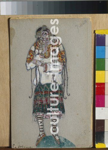 Roerich, Nicholas (1874-1947), Das Mädchen. Kostümentwurf zum Ballett Das Frühlingsopfer (Le Sacre du Printemps) von I. StrawinskI. Gouache und Tempera auf Papier, Symbolismus, 1912. Staatliches Zentrales A. Bachruschin Theatermuseum, Moskau.