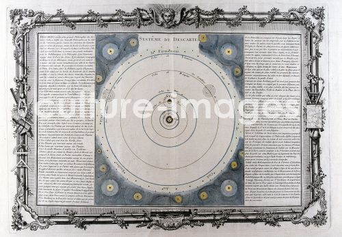 Rene Descartes (1596-1650) French philosopher and mathematician. Plate published Paris, 1761. In the centre is Descartes' system of the universe showing Descartes' idea of the formation of the stars in vortices.