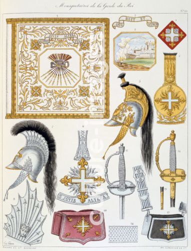 French military accoutrements including sword of the royal guard. From Histoire de la maison militaire du Roi de 1814 a 1830 by Eugene Titeux, Paris, 1890.