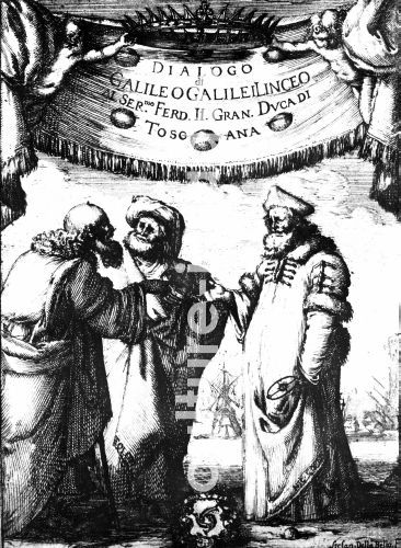 Galileo Galilei (1564-1642) Italian astronomer and mathematician. Frontispiece of first edition of his Dialogo dei Massimi Sistemi Florence 1632. 3 figures, left to right, Aristotle, Ptolemy and Copernicus. Engraving by Della Bella.