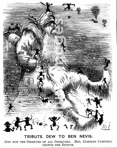 Meteorological observatory on Ben Nevis, Scotland. Cartoon by Harry Furniss (1854-1925) marking its opening. From Punch (London 27 October 1883). Wood engraving.