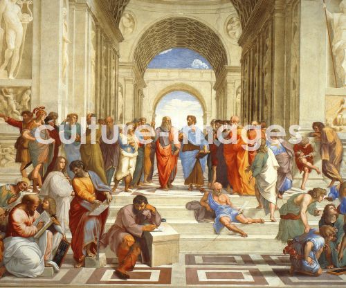 The School of Athens' , 1511 (detail). Fresco. Raphael (Rafael Sanzio 1483 -1520) Italian painter and architect. Plato and Aristotle (centre) in discussion. Ancient Greek Philosophy Science Learning,