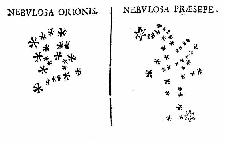 Galileo's observation of the star cluster in Orion and of the Praesepe cluster. Originally published in his Sidereus Nuncius 1610. Woodcut