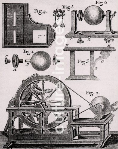 Glass globe static electric machine. Figure 2 shows the wheel of the machine being turned to produce electricity by friction on the glass globe. The other figures are the glass globe and its mounts. From Recherches sur les Causes Particulaires des Phenomenes Electriques by Abbe Nollet (Paris, 1753). Engraving.