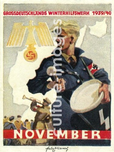 1002319 Deutschland, Drittes Reich, Winterhilfswerk ( 1. Kriegswinterhilfswerk ), Spendenbeleg 1939 / 40, herausgegeben November 1939, Hitlerjunge mit Trommel, Originalgröße : breit 8,5 cm , hoch 11 cm. Motiv darf nur zu wissenschaftlichen oder journalistischen Zwecken verwendet werden ! Germany, the so called Third Reich, Winter Welfare 1939 / 40 ( the first War Winter Welfare ) , receipt for a donation to charity of the WHW ( winter relief organization of the National Socialism ), Hitler youth with drum , original size 8,5 cm to 11 cm . image only for journalistic or academic use !