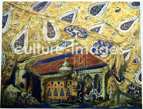 Bakst, Léon (1866-1924), Bühnenbildentwurf zum Ballett Scheherazade von N. Rimski-Korsakow, Farblithographie, Theatermalerei, 1910, Russland, Privatsammlung.