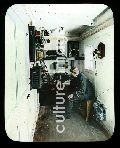 Blick in die Funker-Kabine mit dem heldenmutigen Telegrafisten, der bis zum letzten Augenblick auf seinem Posten ausgeharrt hat, Dia-handkoloriert aus Vortragsreihe: Der Untergang der Titanic. Sammlung Carl Simon 1912