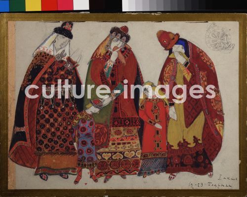 Roerich, Nicholas (1874-1947), Kostümentwurf zur Oper Fürst Igor von A. Borodin, Bleistift, Gouache und Tusche auf Papier, 26,2x35, Symbolismus, 1914. Russland, Staatliches Zentrales A. Bachruschin Theatermuseum, Moskau.