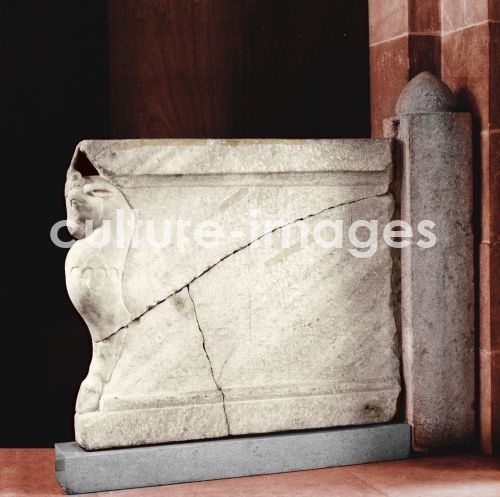 Chancel of a church, it was used to delimit the area reserved for the clergy, It consists of a pillar and a stone slab ending with a wild goat. One of a pair. Lebanon. Byzantine. 395 636 AD. Beirut.