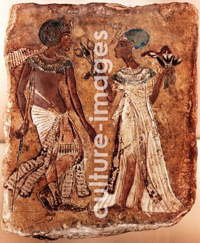 Sculptors test relief depicting a king and his queen holding a bouquet of flowers, Identification of the royal couple has not been easy but it is thought that they are Smenkhkare, Tutankhamuns elder brother, and Merytaten, Akhenatens eldest daughter. Ancient Egypt. Ancient Egyptian. c 1336 BC.