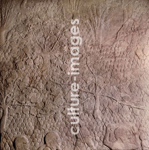 A detail of a relief showing a procession of prisoners after the siege of Lachish, This detail shows a vineyard. Assyrian. Late Assyrian c 645 BC. Nineveh, Assyria, Ancient Iraq.