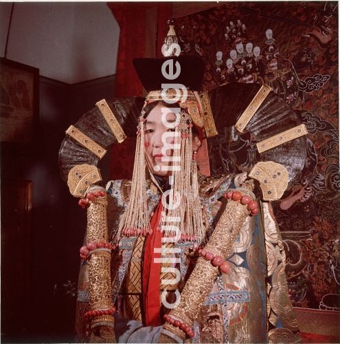 Mongolian woman dressed in the bridal costume of the Great Khans, Mongolian Peoples Republic. 1962. Ulan Bator.