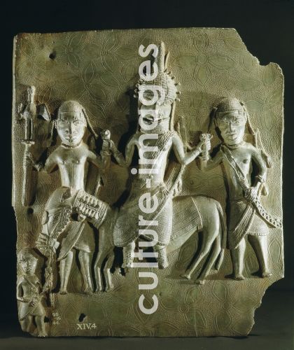 Benin brass plaque from the palace, depicting an Oba on horseback supported by two retainers, Nigeria. Edo. probably early 17th c Benin.