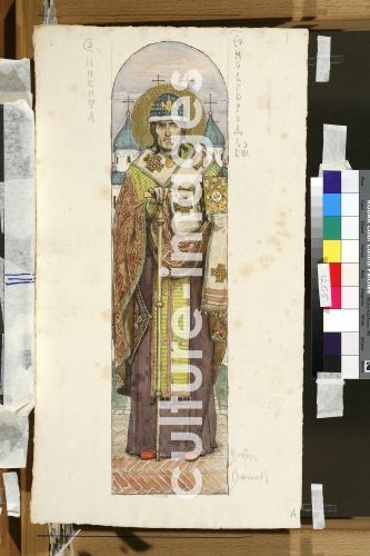 Wasnezow, Viktor Michailowitsch (1848-1926), Heiliger Nikita von Nowgorod (Entwurf für die Fresken in der Wladimirkathedrale in Kiew), Aquarell, Gouache, Gold und weisse Farbe auf Papier, 48,6x26, 1884-1889. Russland, Jugendstil, Staatliche Tretjakow-Galerie, Moskau.